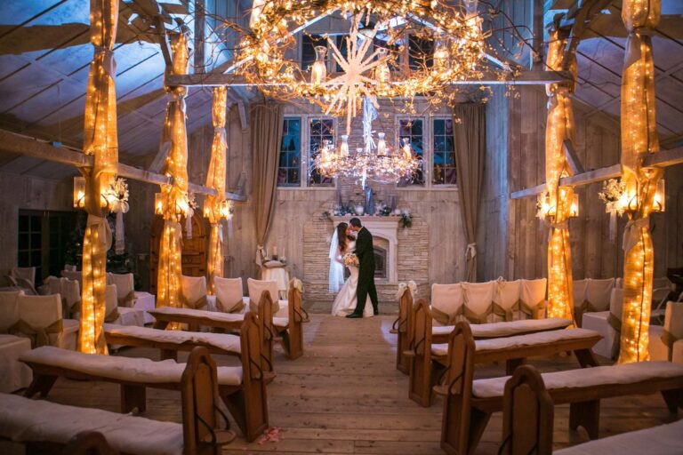Mula sa napakarilag na ilaw hanggang sa “niyebe”-natatakpan na mga bangko, ang setup ng seremonya na ito ay perpekto para sa isang kasal sa taglamig.